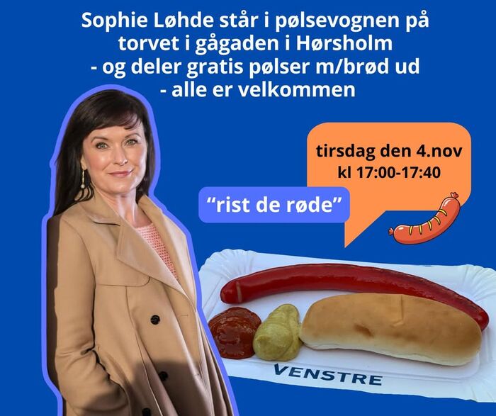 🌭 Sophie Løhde tænder op i pølsevognen i Hørsholm! Tirsdag den 4. november kl. 17.00–17.40 kan du møde Sophie Løhde på torvet i gågaden i Hørsholm, hvor hun deler gratis pølser m/brød ud. Kom forbi til…