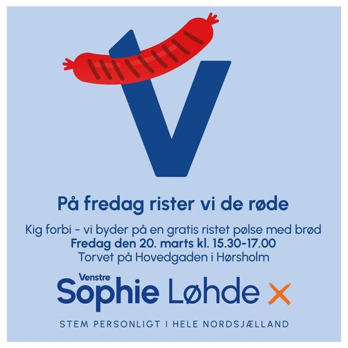 Ses vi på fredag kl 15:30? 🌭 Sophie Løhde tænder op i pølsevognen i Hørsholm! Fredag den 20. Marts kl. 15:30–17.00 kan du møde Sophie Løhde på torvet i gågaden i Hørsholm, hvor hun deler gratis pølser…