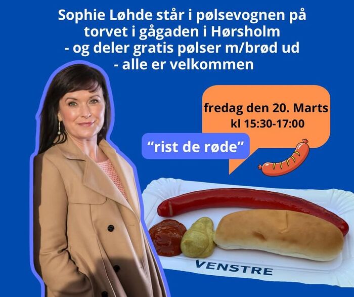 Ses vi i morgen kl 15:30? 🌭 Sophie Løhde tænder op i pølsevognen i Hørsholm! Fredag den 20. Marts kl. 15:30–17.00 kan du møde Sophie Løhde på torvet i gågaden i Hørsholm, hvor hun er i pølsevognen og…